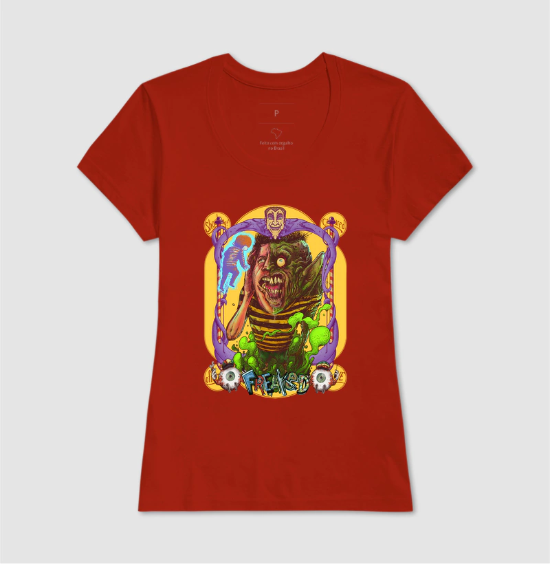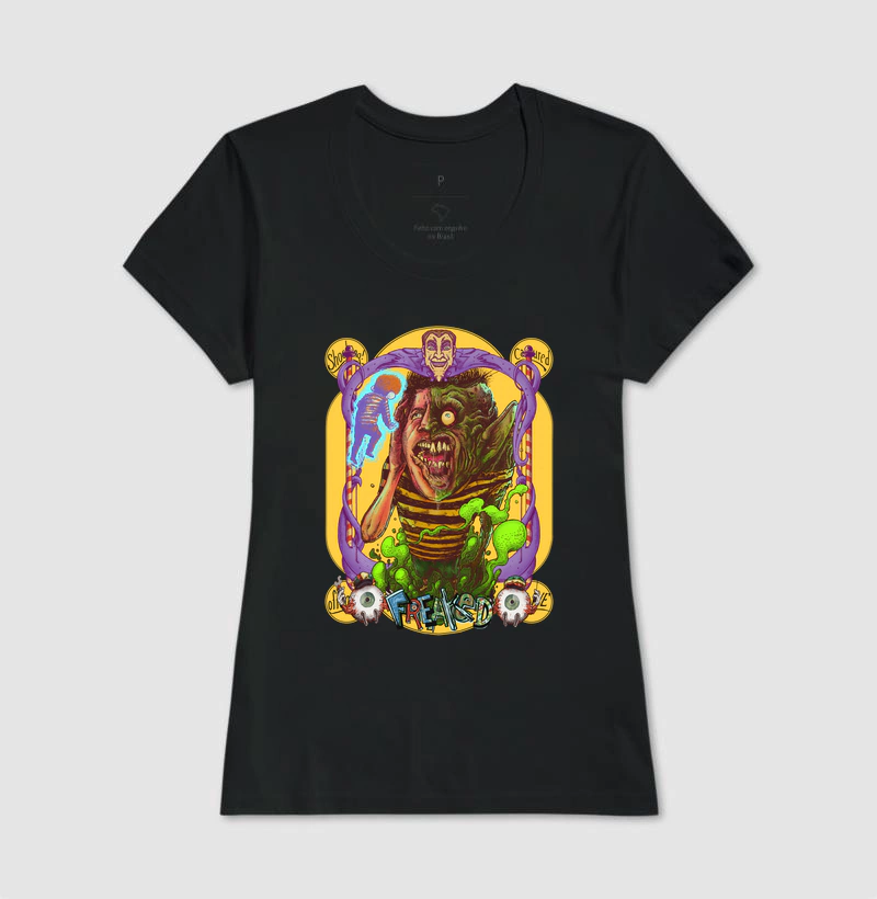 Camiseta tradicional e baby look com a arte do filme "Freaked - Freaklândia: O Parque dos Horrores" de 1993 de Tom Stern e Alex Winter - Concept Art Exclusiva para o Cine Phenomena Festival