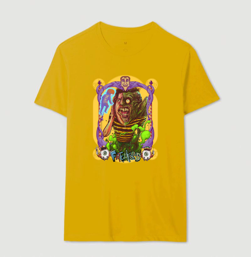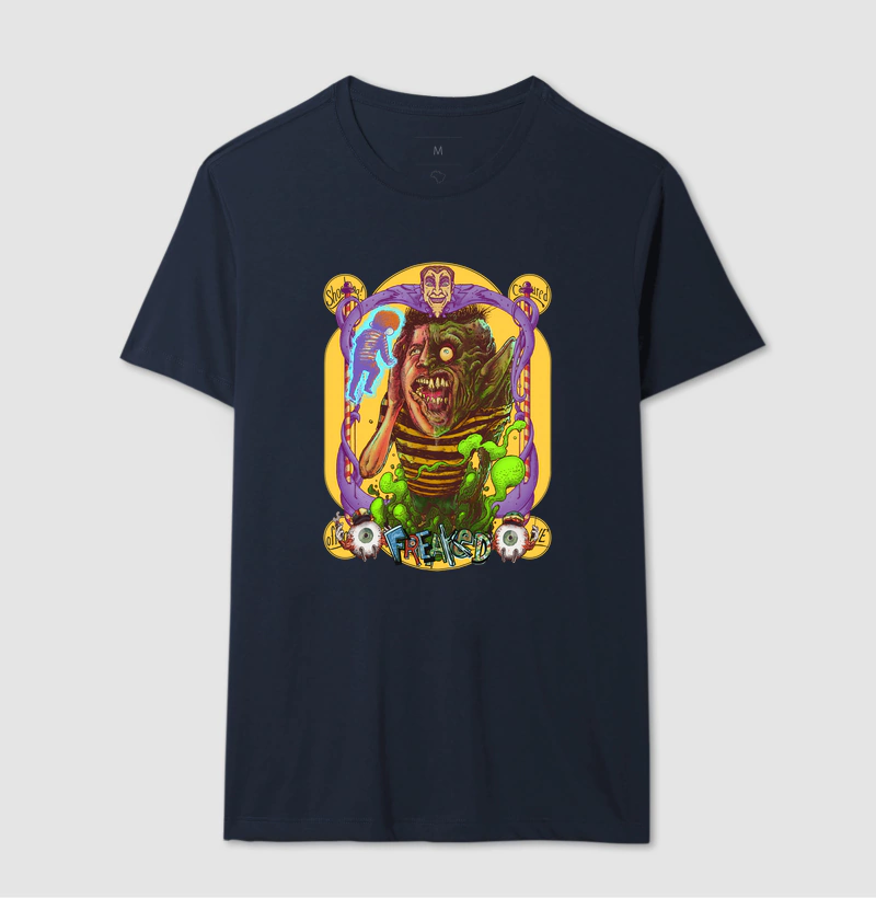 Camiseta colorida, em duas modelagens, tradicional, 100% algodão, gola careca com a arte do filme "Freaked - Freaklândia: O Parque dos Horrores" de 1993 de Tom Stern e Alex Winter - Concept Art Exclusiva para o Cine Phenomena Festival